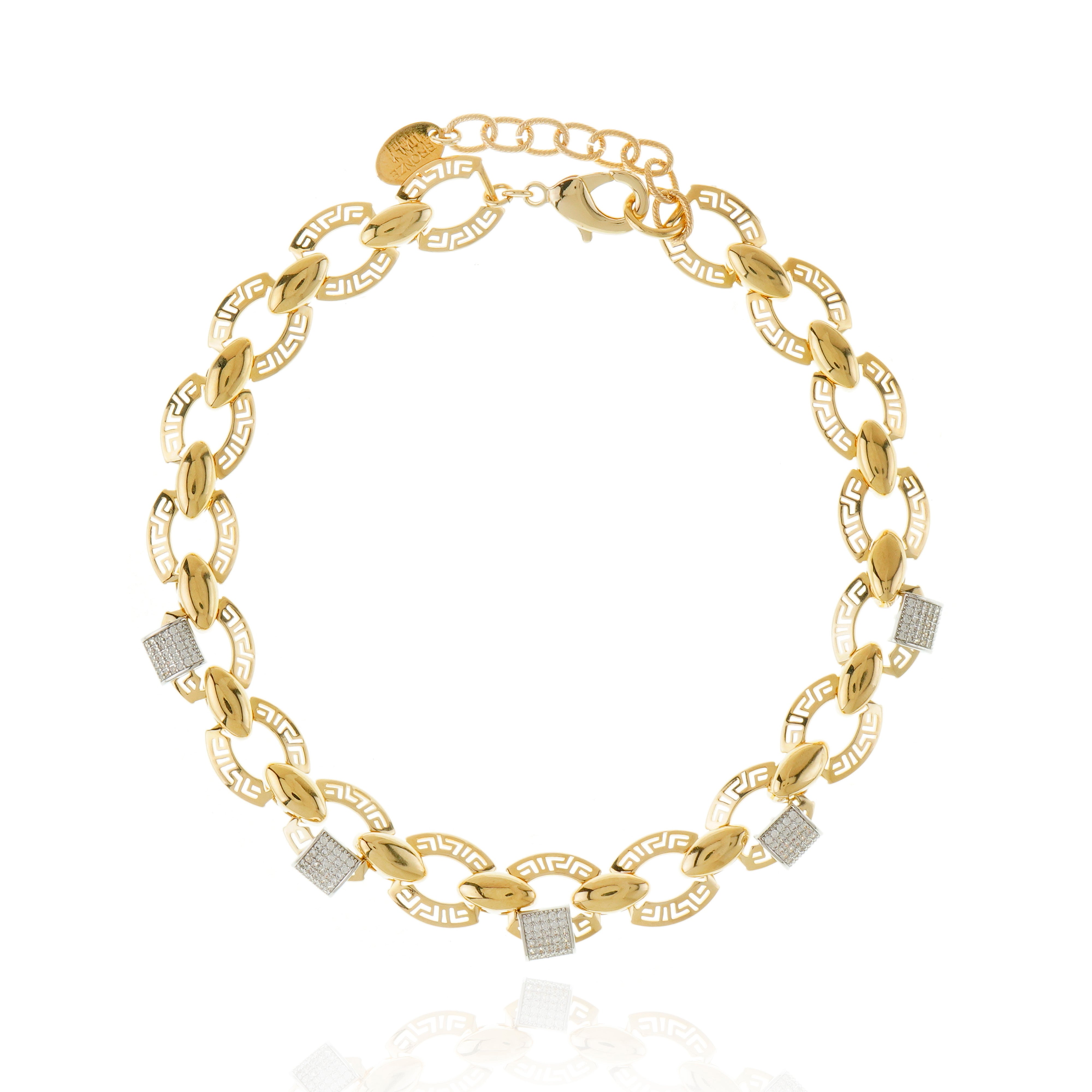 Crafted in Italy, this choker brings bold elegance to the neckline with precision-cut Greca links in gold-plated bronze and brilliant cubic zirconia accents. A statement of modern luxury with classic inspiration, perfect for layering or wearing solo.