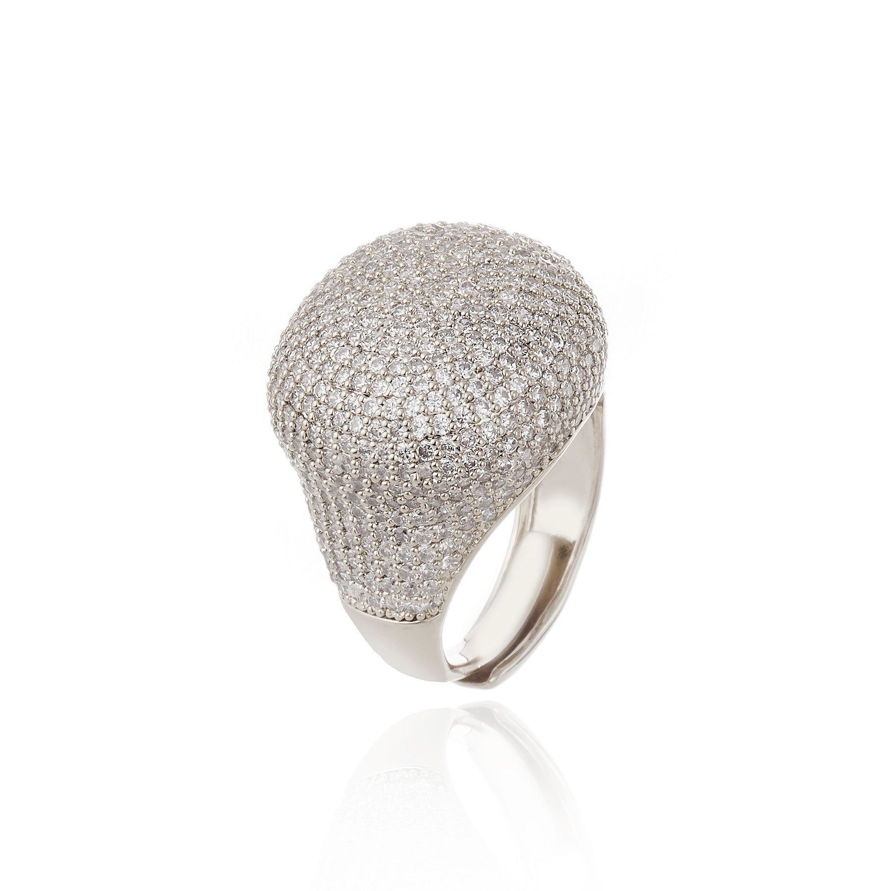 Sculptural and radiant, the Ceresolo Ring is designed to impress with its bold silhouette. The domed surface is fully encrusted with pavé-set cubic zirconia, creating a refined sparkle that catches the light from every angle. Crafted in rhodium-plated bronze, it offers a luminous silver tone that enhances the brilliance of its intricate pavé work.