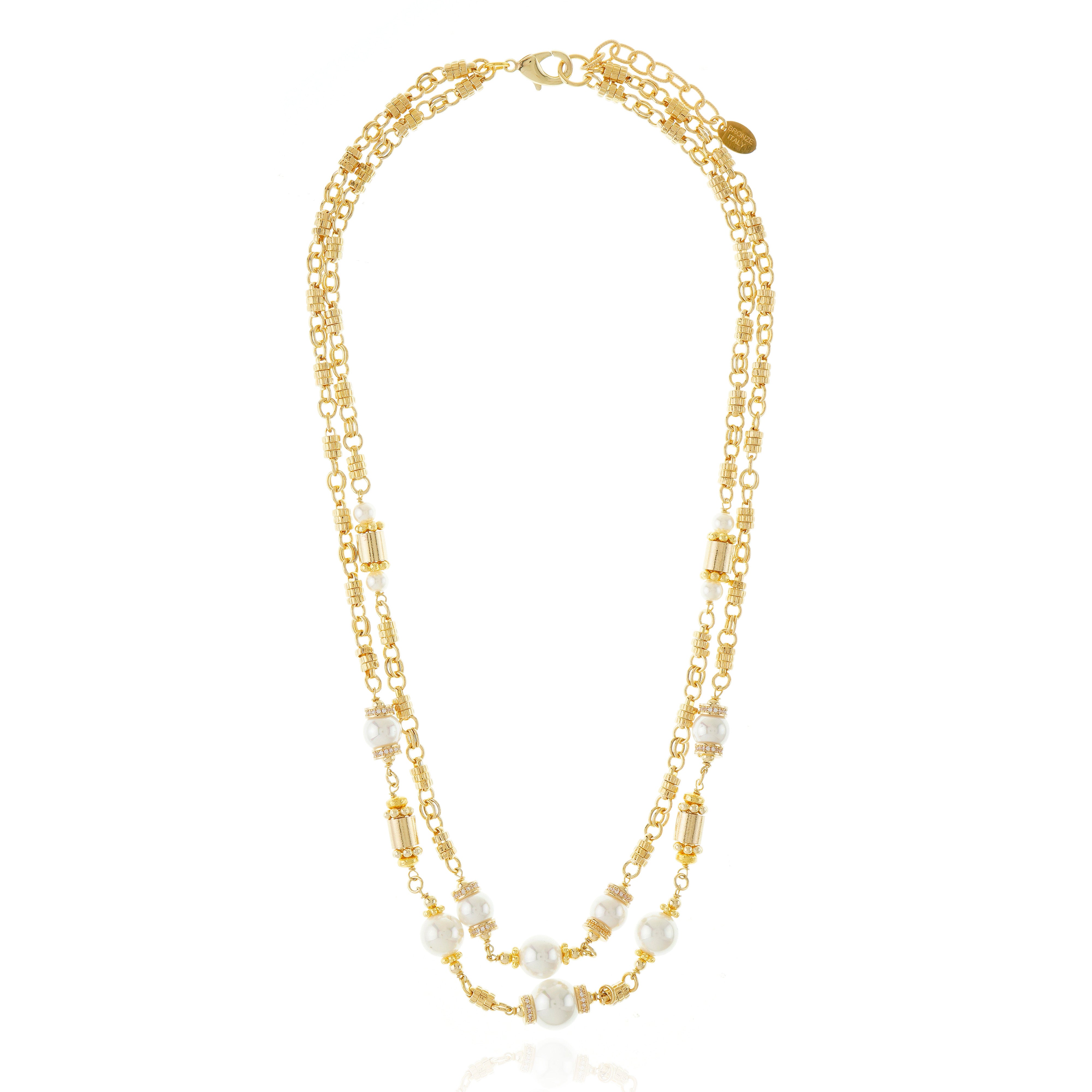 Design: Double-strand necklace with alternating pearl and textured gold elements