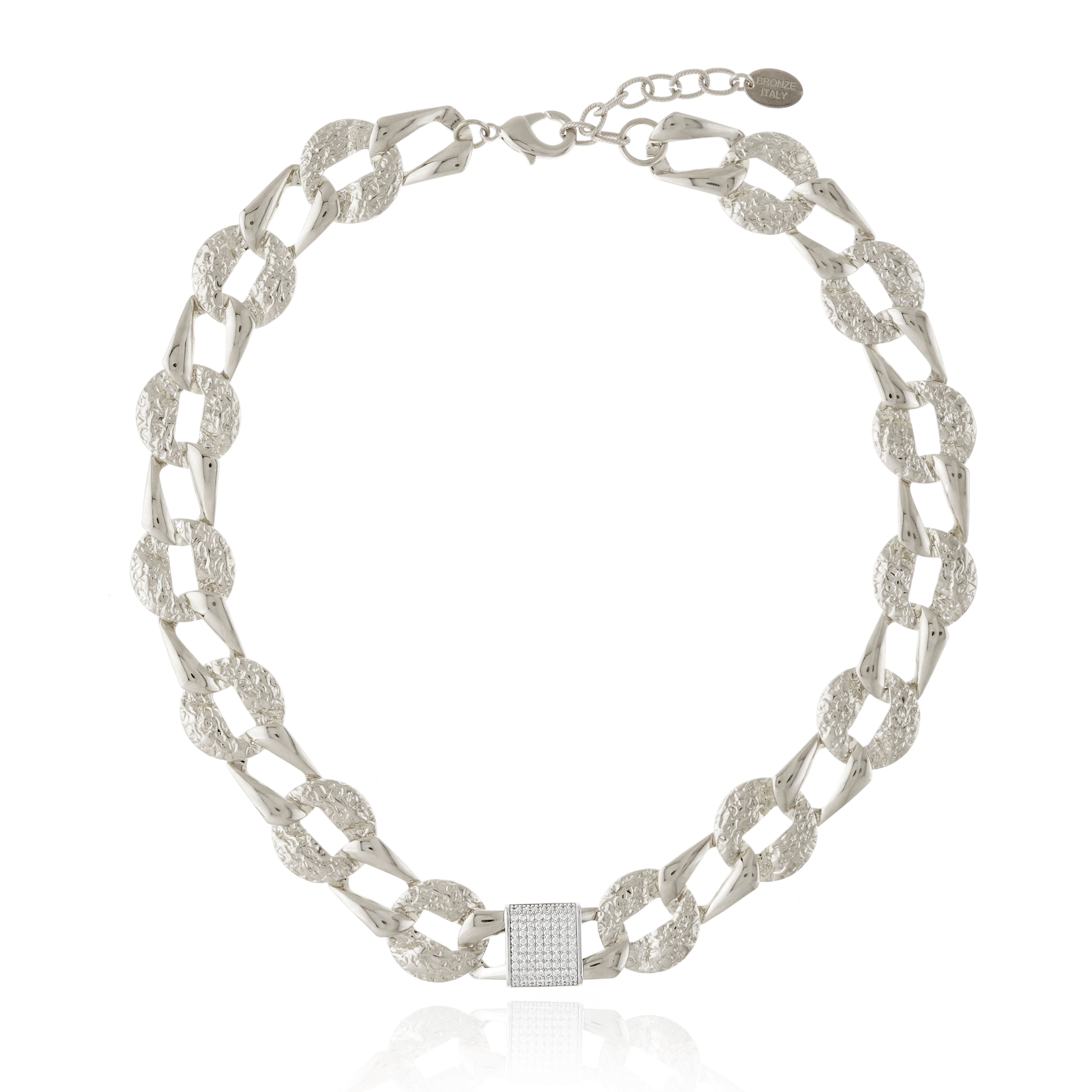 Inspired by the shimmering reflections on the waters of Lake Maggiore, this statement necklace features oversized textured links in rhodium-plated bronze, paired with a dazzling centerpiece set with cubic zirconia. The combination of polished and hammered finishes adds depth and a touch of modern sophistication to this Italian-made masterpiece.