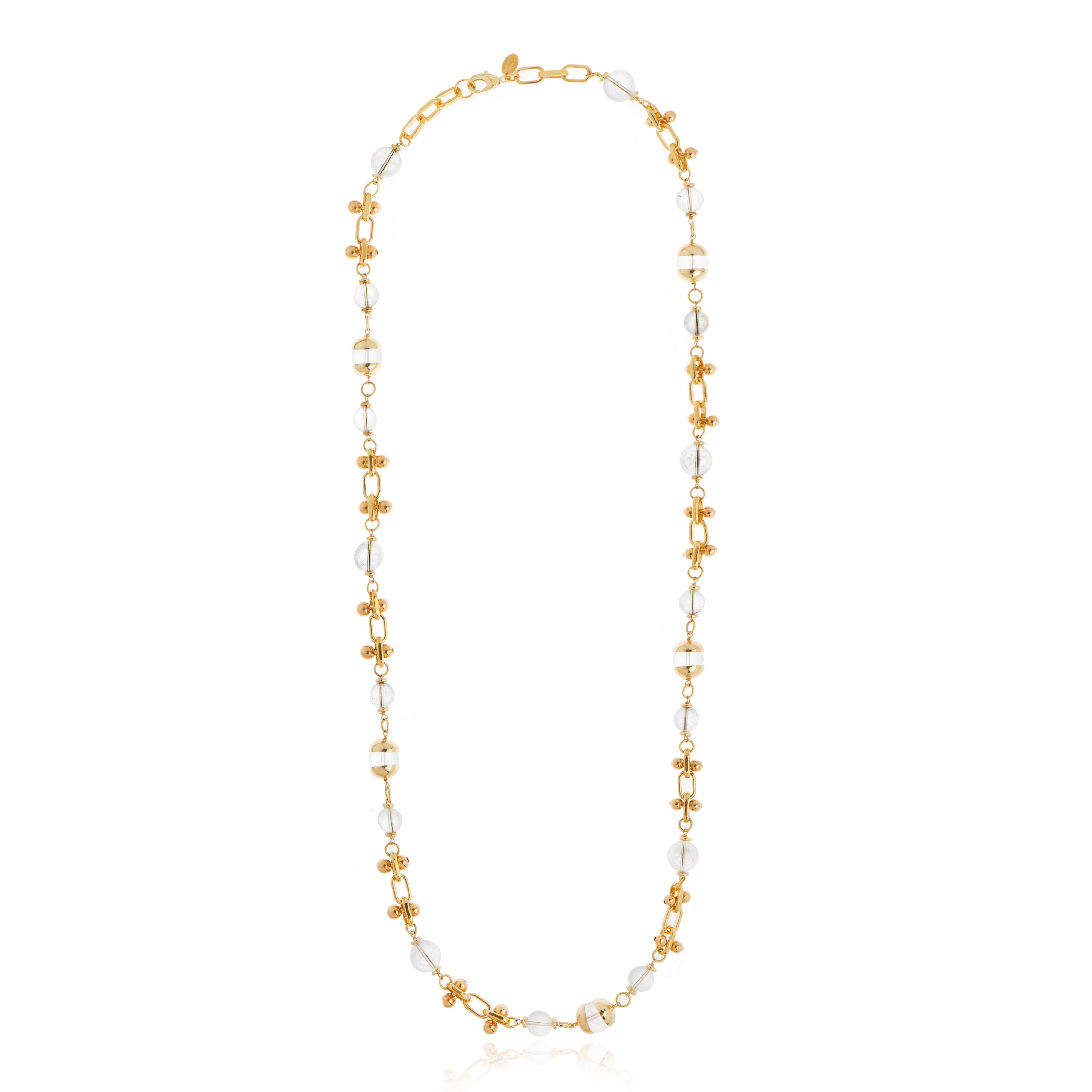 Elegant and luminous, the Liuce Long Necklace is a celebration of grace and divine protection. Featuring a refined combination of clear crystals, golden beads, and baroque pearls, its delicate yet intricate structure evokes celestial harmony.