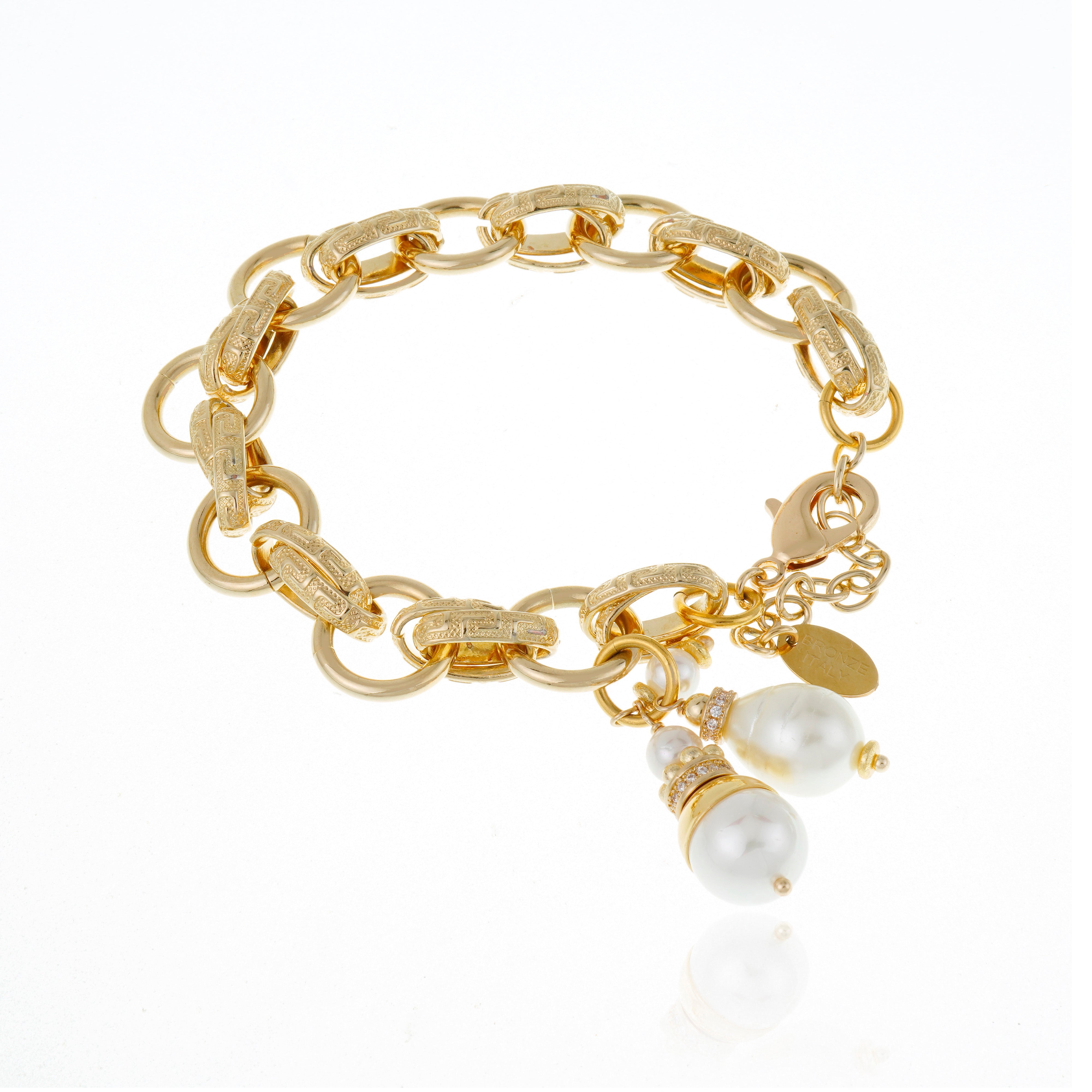 Crafted in Italy from gold-plated bronze, the Sirena Bracelet features textured oval and round links in a dynamic pattern, exuding bold sophistication. Two luminous pearls, crowned with pavé zirconia accents, dangle delicately from the clasp, evoking the timeless charm of the sea with an opulent finish.