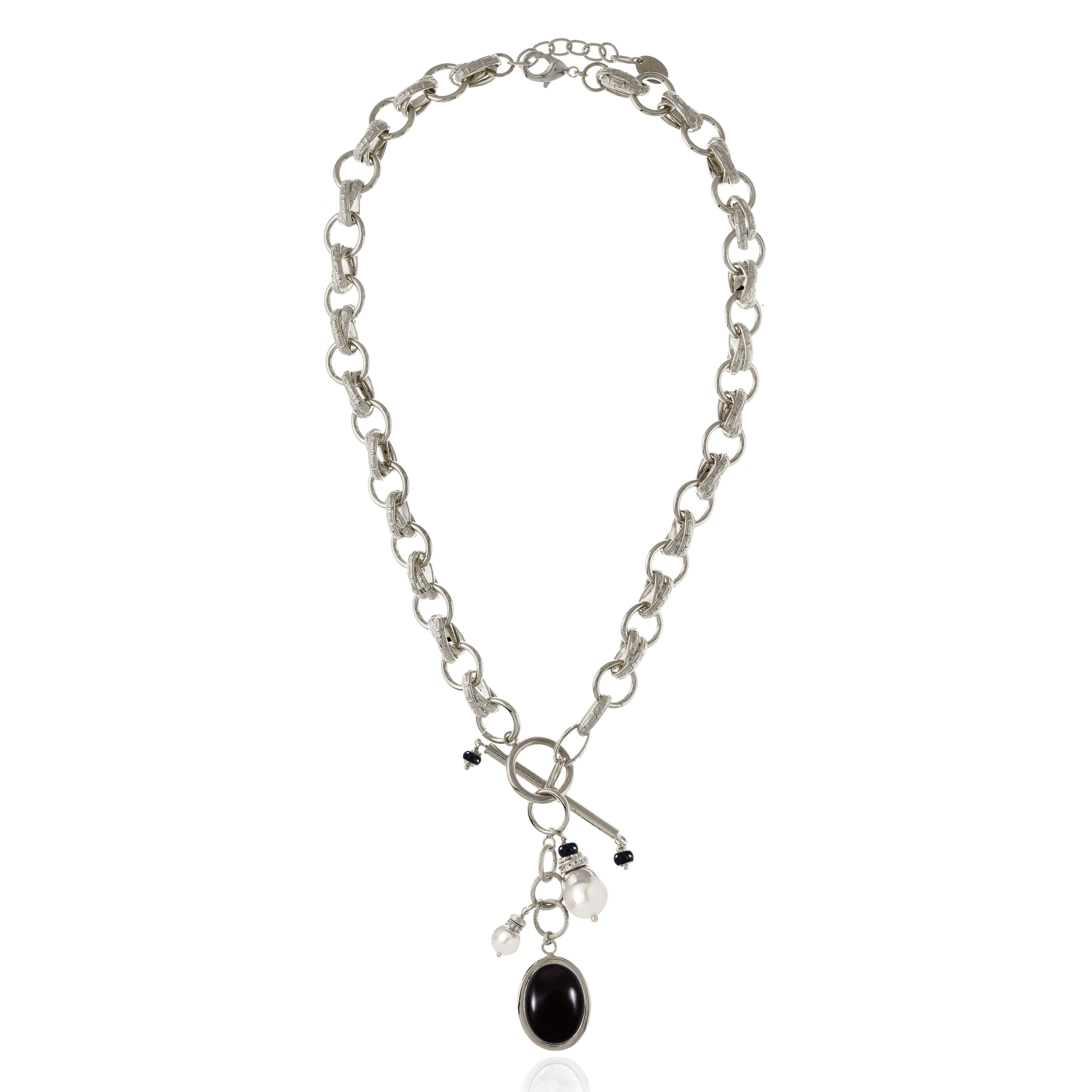 A bold expression of contrast and sophistication, the Sirena Necklace Black Agate reimagines classic Italian chains with a touch of modern allure. Crafted in rhodium-plated bronze, this piece features a textured link chain and a front toggle clasp, adorned with charms of luminous pearls and deep black agate. Each element moves gracefully, reflecting refined craftsmanship and timeless elegance.