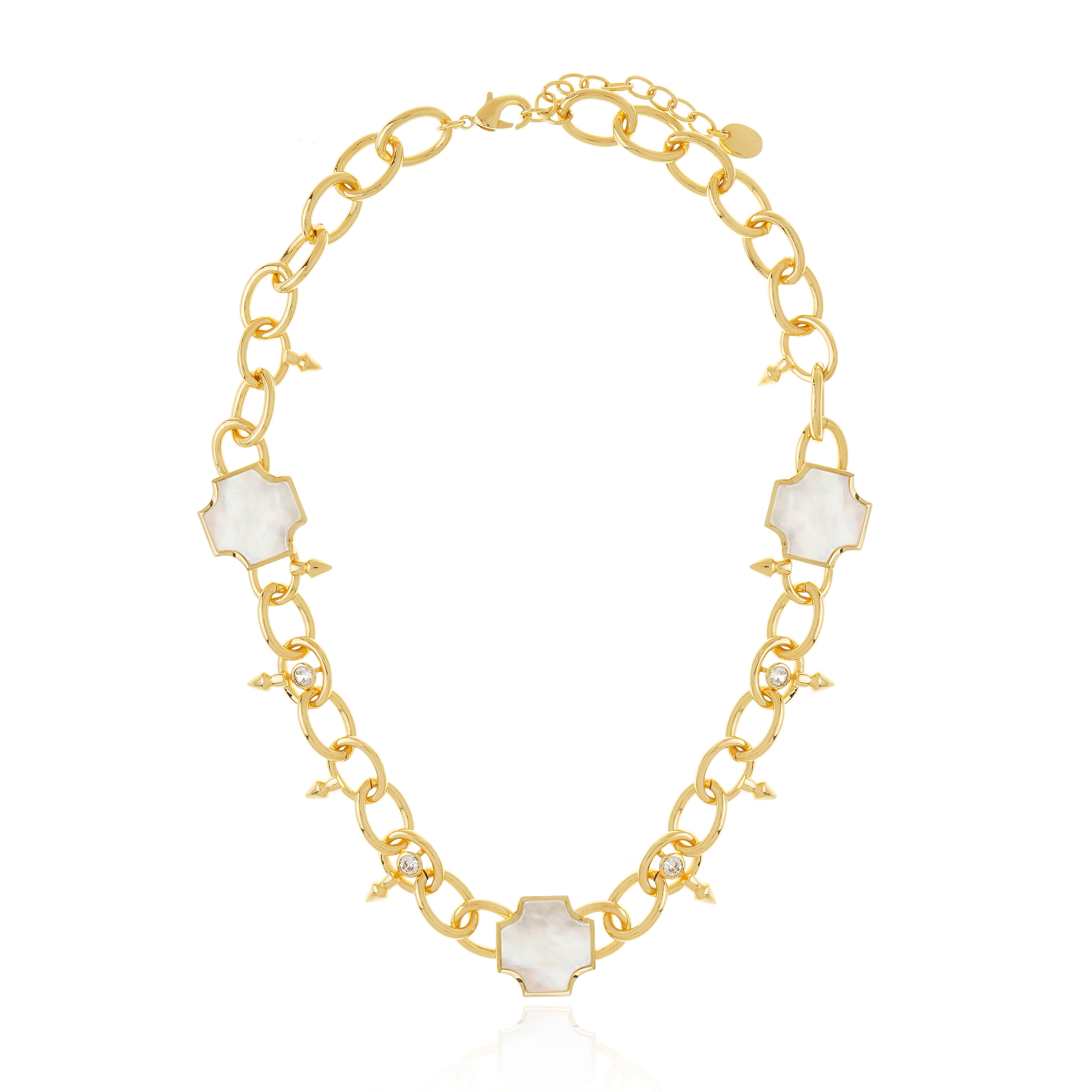 The Harmonia Necklace expresses balance and contemporary elegance through a bold yet refined silhouette. Crafted in gold-plated bronze, the design features an elongated chain accented with geometric White Mother of Pearl stations, each framed by sculptural details that add rhythm and visual harmony to the piece. The luminous mother-of-pearl contrasts beautifully with the polished gold finish, creating a statement necklace that feels both modern and timeless.