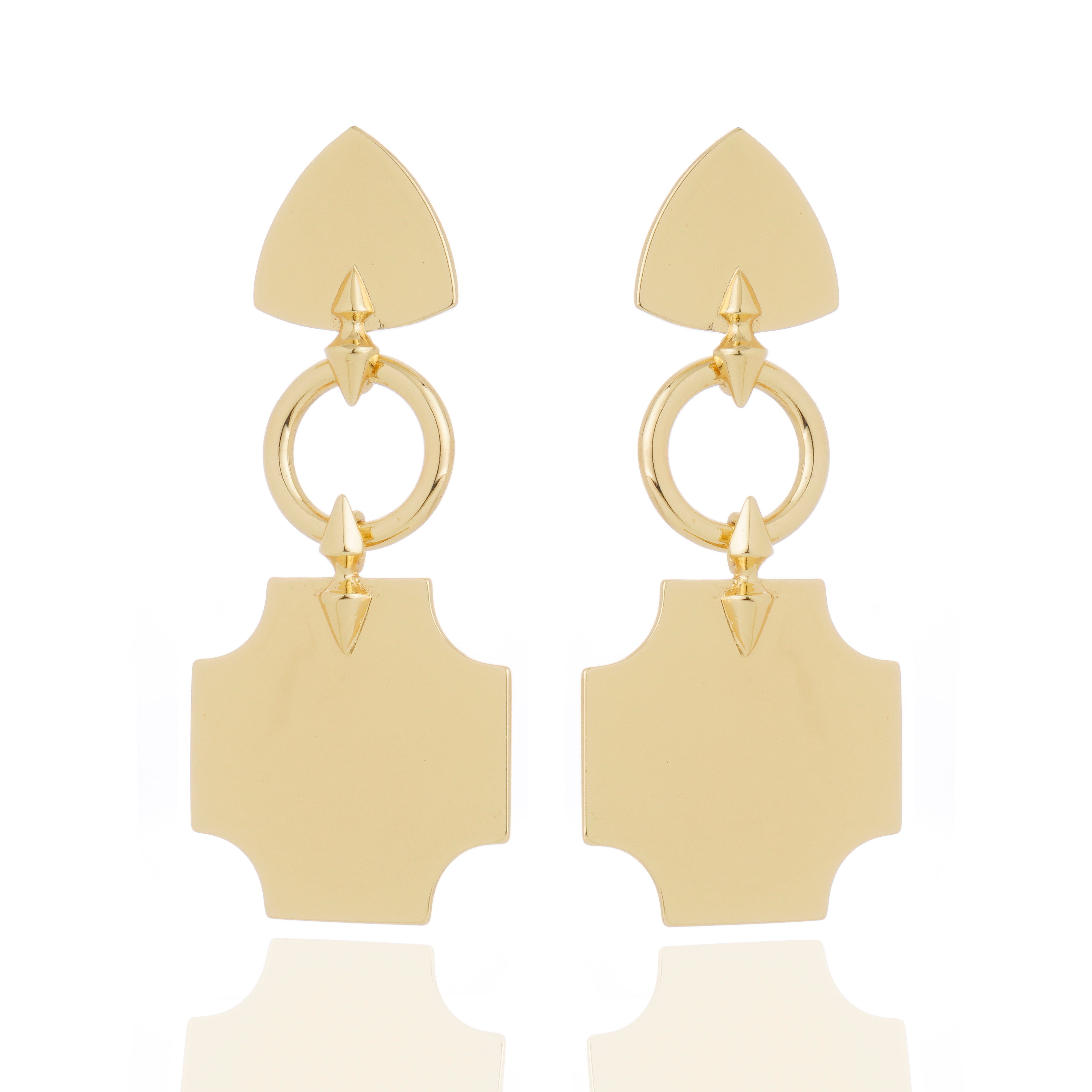 The Hedone Earrings make a bold statement through sculptural form and polished gold finish. Featuring a striking geometric composition with articulated elements, this design balances architectural strength and refined elegance. The high-shine gold surface enhances the clean lines and graphic silhouette, creating an impactful yet sophisticated accessory that elevates both day and evening looks.