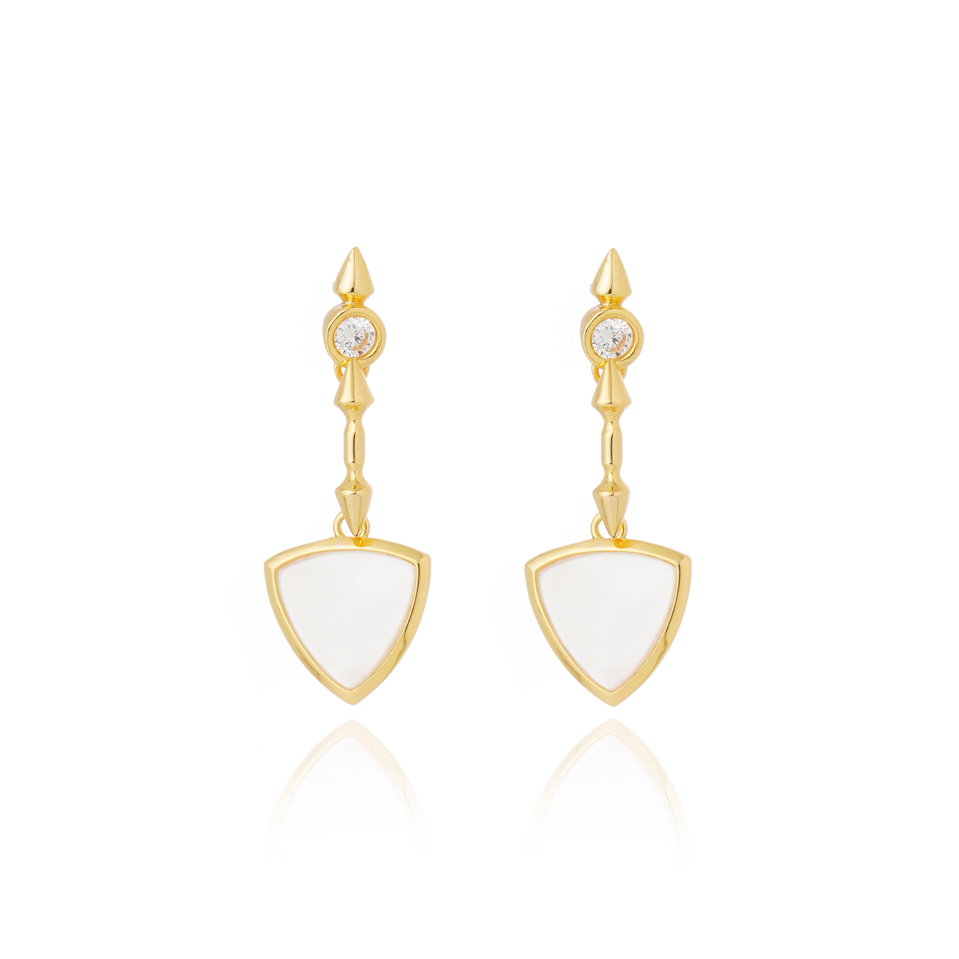 The Himeros Earrings feature elongated gold-toned elements finished with triangular white mother of pearl pendants. Subtle crystal accents add a delicate sparkle, creating a balanced silhouette that feels timeless yet contemporary.