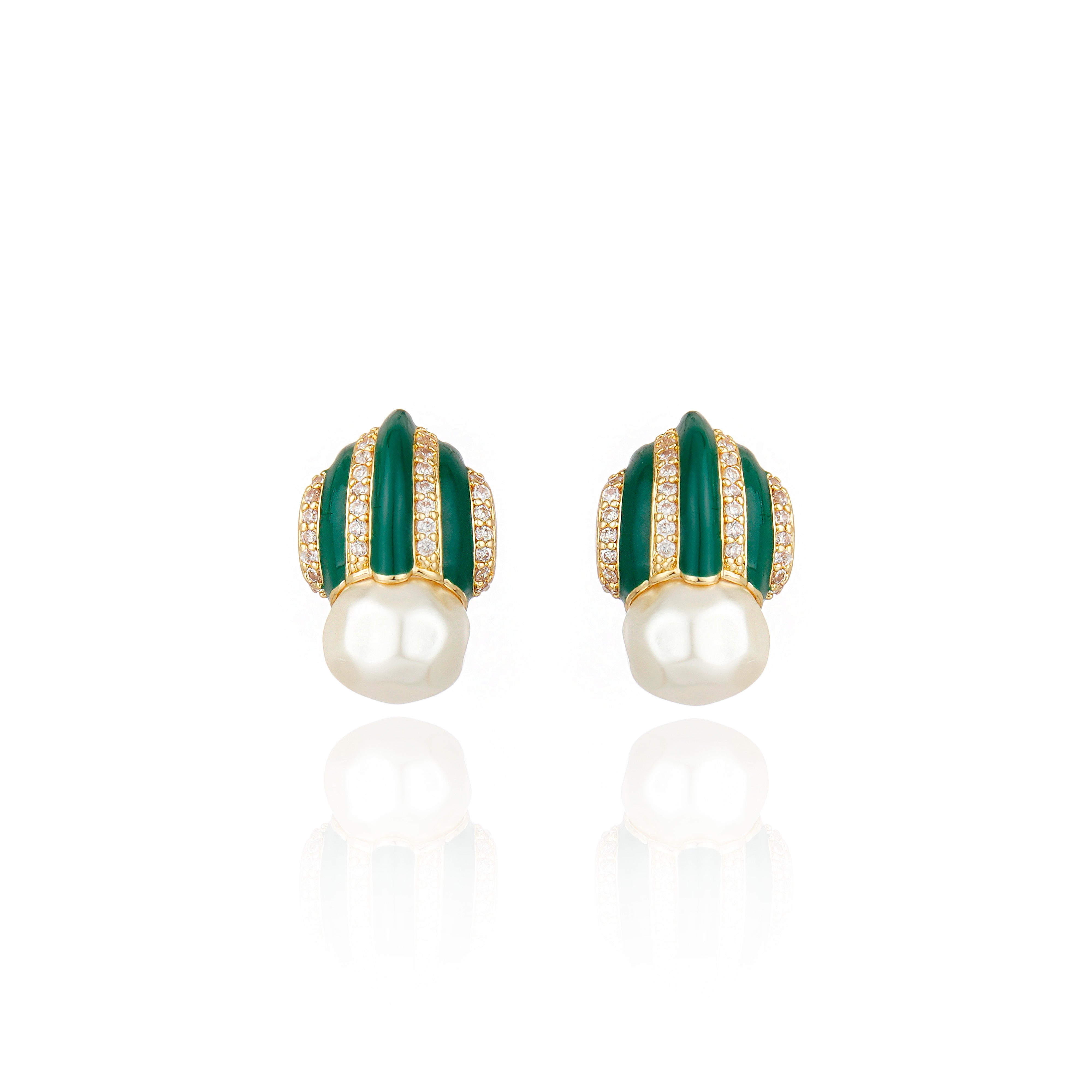 The Graz Earrings Green combine bold color with sculptural elegance in a refined statement design. Crafted in bronze with 18K and 24K gold plating, the earrings feature rich green stones framed by pavé crystal bands that enhance their brilliance and structure. A luminous pearl drop adds softness and movement to the piece, creating a sophisticated contrast between vibrant color, sparkle, and classic elegance.