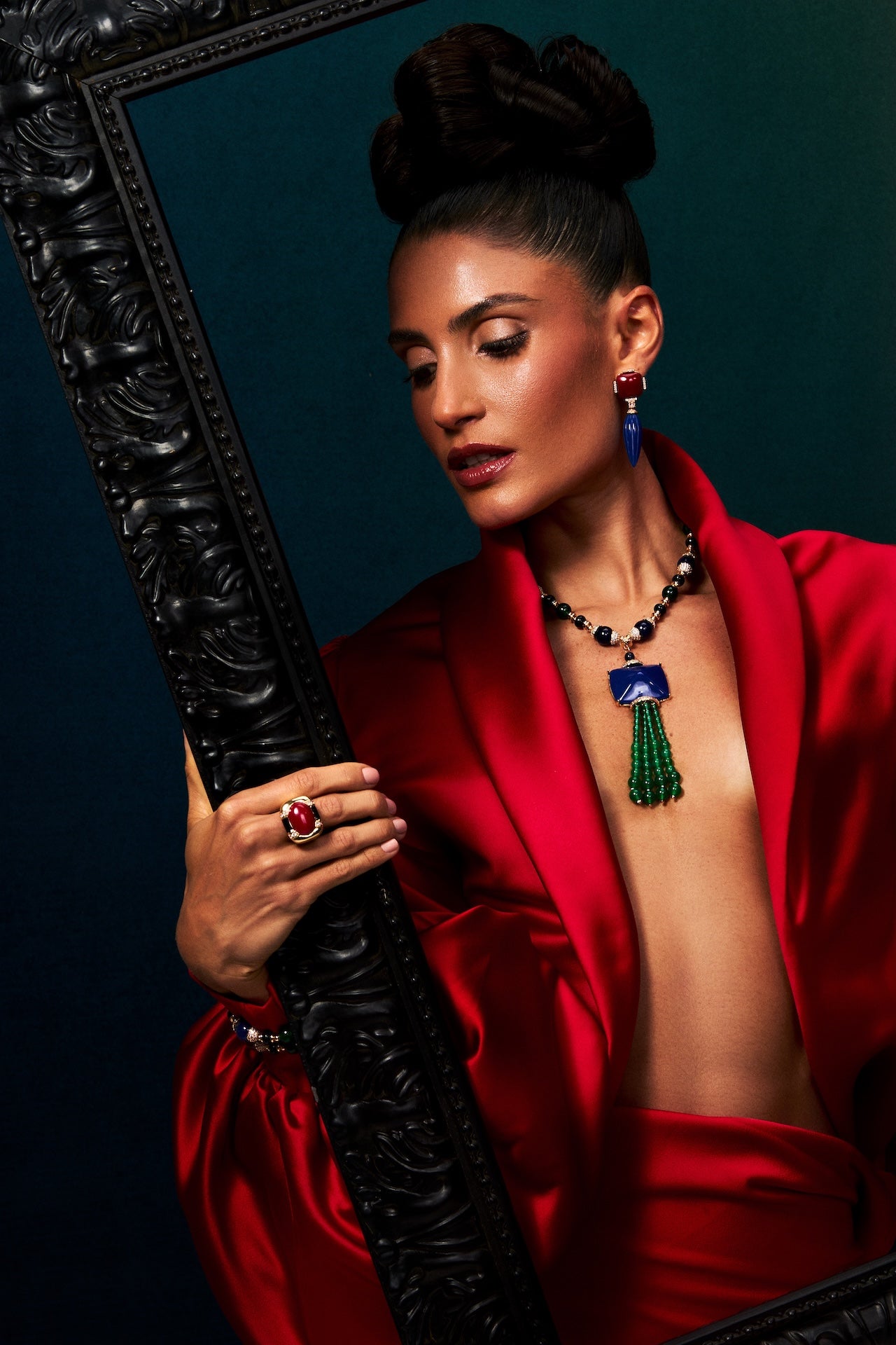 The Tarsila Necklace Blue and Green Agate showcases a striking combination of vibrant natural stones and sculptural design. Crafted in bronze with 18K and 24K gold plating, the necklace features alternating blue and green agate beads that create a rich and dynamic color composition. At the center, a bold blue stone pendant anchors the design, finished with cascading strands of green agate that add movement and dramatic elegance. The piece reflects artistic inspiration and refined Italian craftsmanship, making it a true statement accessory.