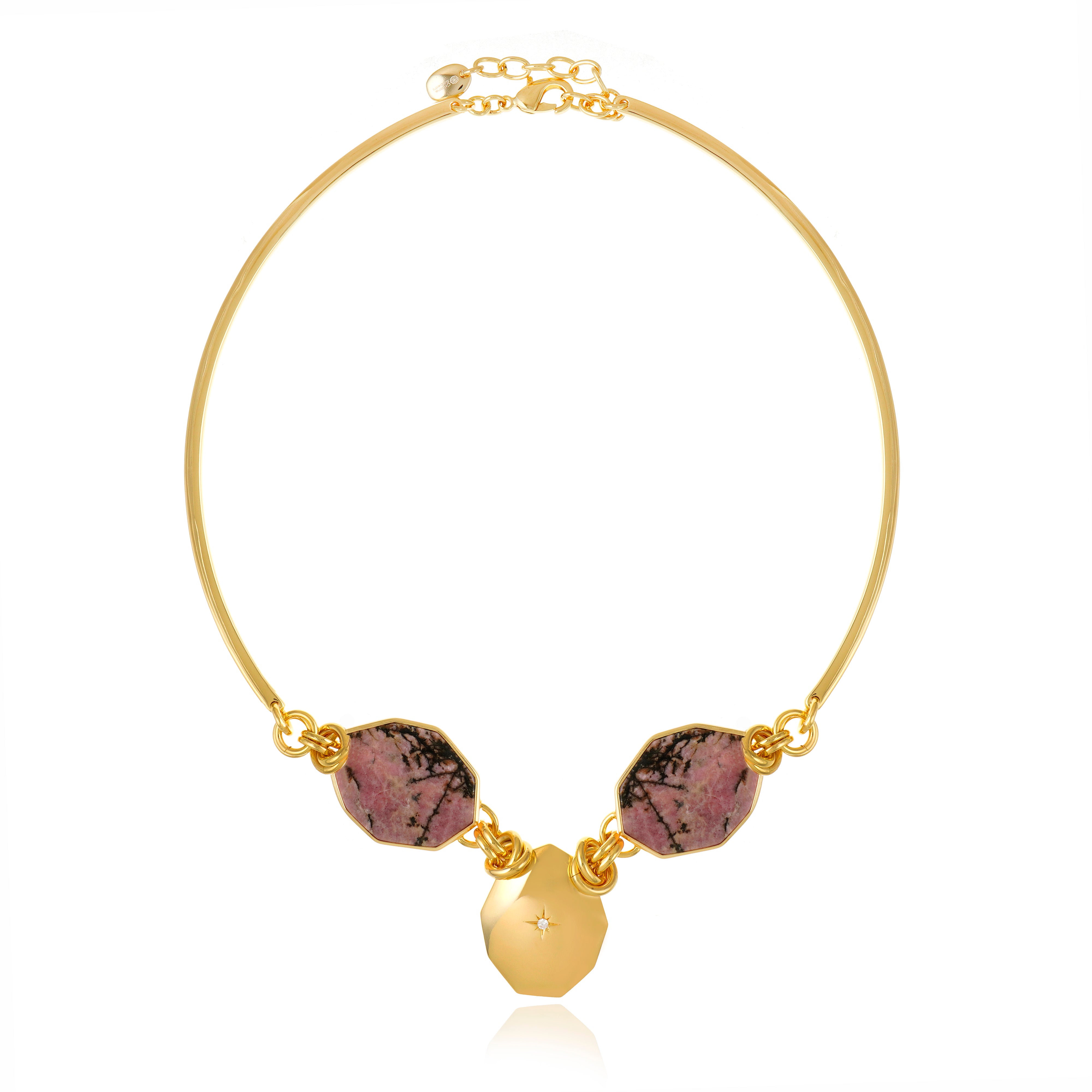The Icon Concept Shine Star Necklace is a striking fusion of celestial symbolism and refined design. This sleek gold collar is adorned with two radiant Rhodonite stones, known for their soft pink hues and grounding energy. At its center, a gold charm engraved with a shining star motif adds symbolic brilliance, complemented by gold knot accents for a sophisticated finish.