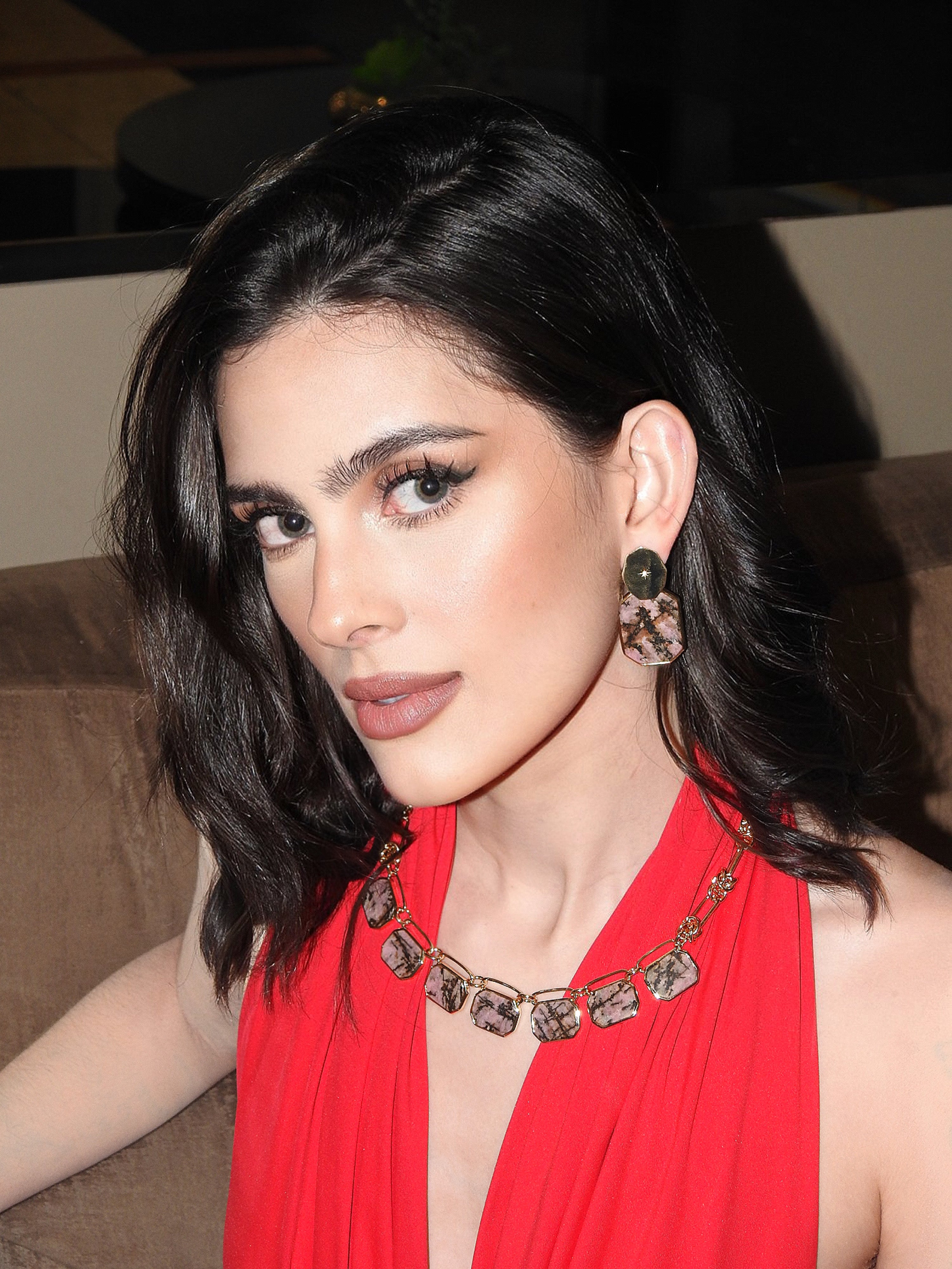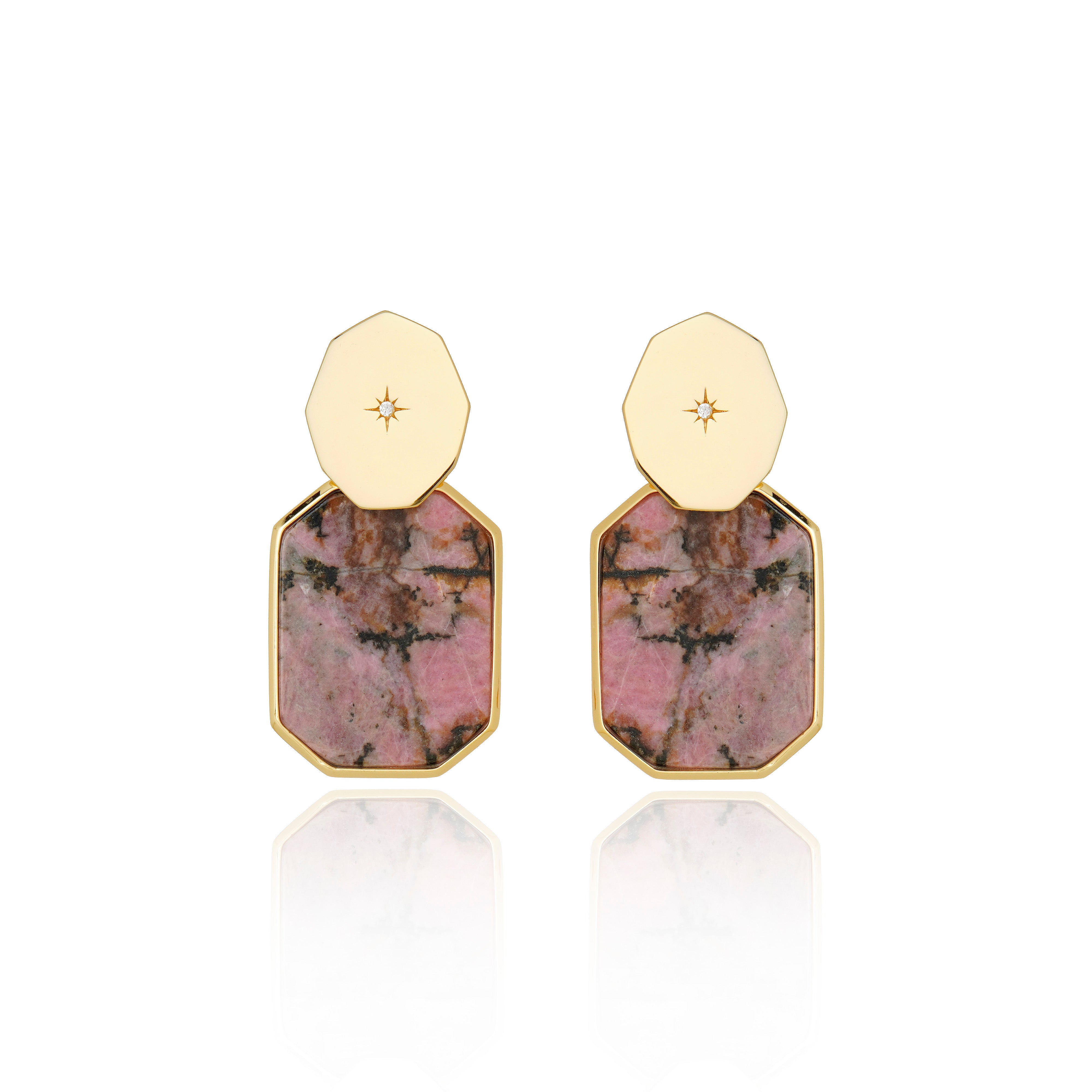 Elevate your elegance with the Icon Double Stack Earring, a perfect blend of modern minimalism and timeless charm. Featuring two stacked geometric shapes, this design showcases the rich, rosy hues of Rhodonite, elegantly encased in gold plating. The upper stud is adorned with a starburst engraving, adding a subtle yet striking detail.