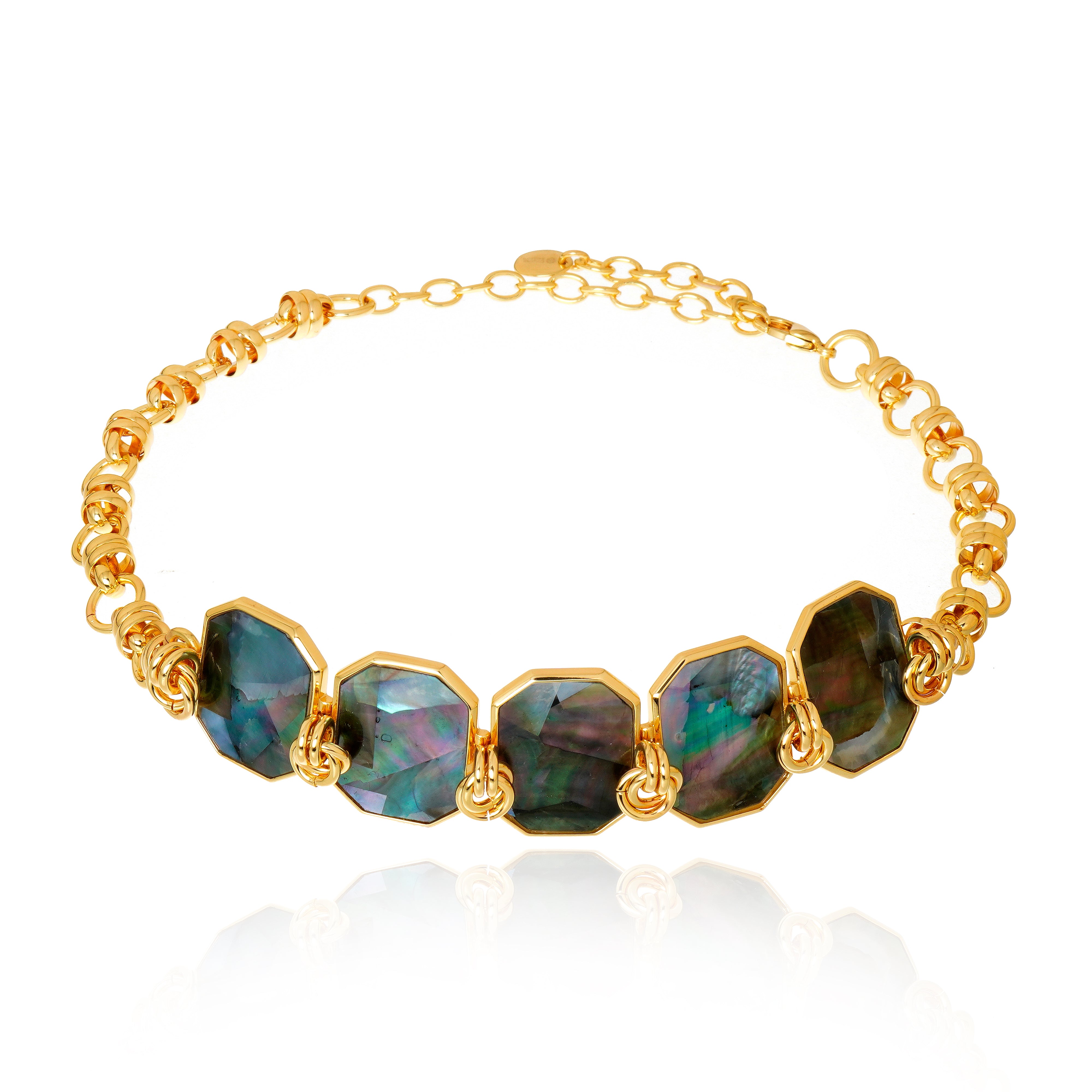 Introducing the Icon Knot Choker, a masterpiece of elegance and modern artistry. This stunning choker showcases a series of luminous black mother-of-pearl stones, beautifully framed in radiant gold and linked with intricate knotted metalwork. The deep, iridescent tones of black mother-of-pearl add a touch of mystery and sophistication, making this piece a versatile statement for any occasion.