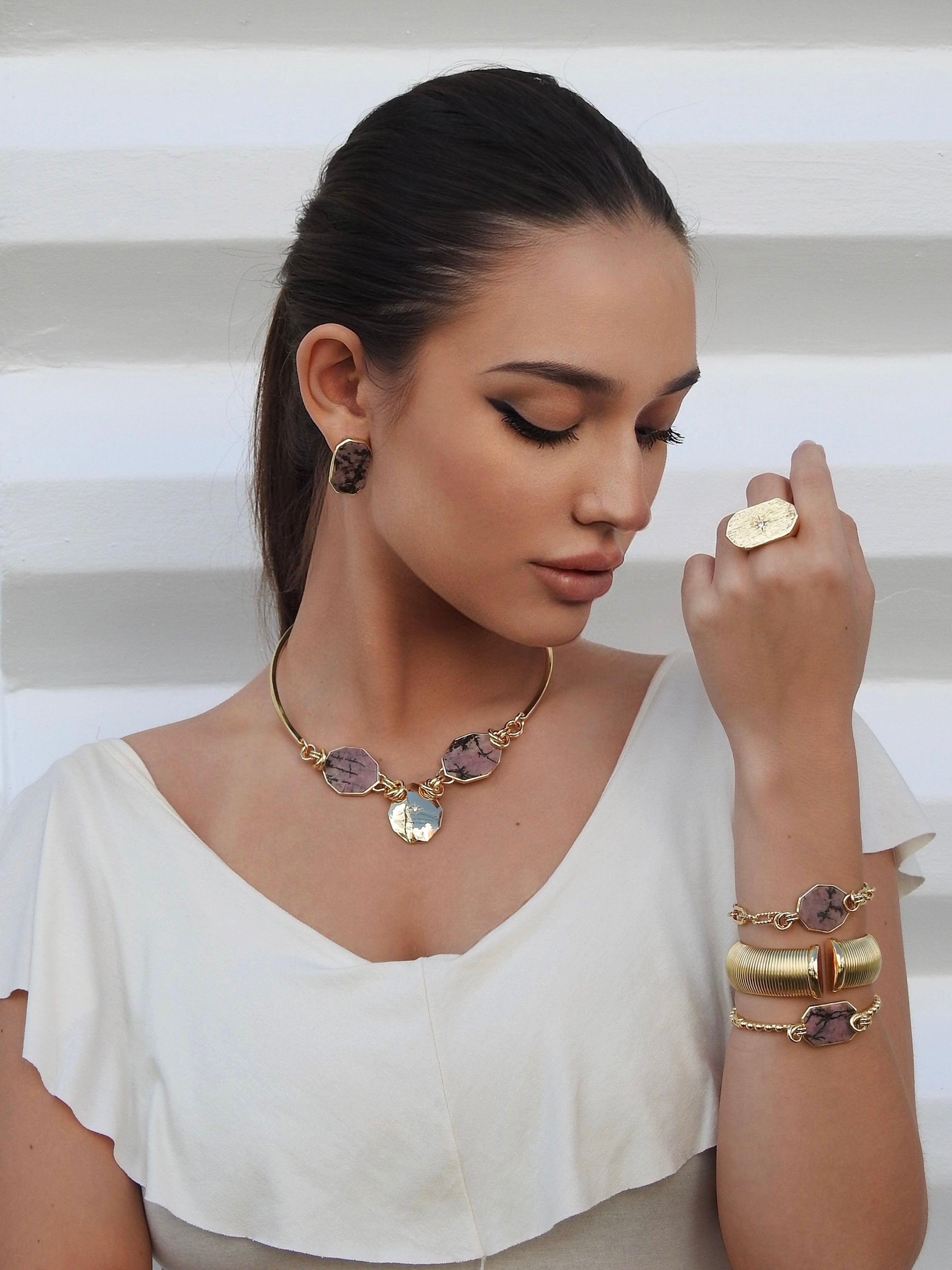 A refined statement of modern luxury, the Icon Link Bracelet captures the warm and rich tones of rhodonite, set in an elegant octagonal gold bezel. The vibrant pinkish-red hues of rhodonite symbolize passion and strength, offering a bold yet sophisticated touch to your jewelry collection. The intricate link chain, with a mix of textured and polished finishes, adds dimension and contemporary appeal, while delicate gold knots elevate the design with timeless elegance.