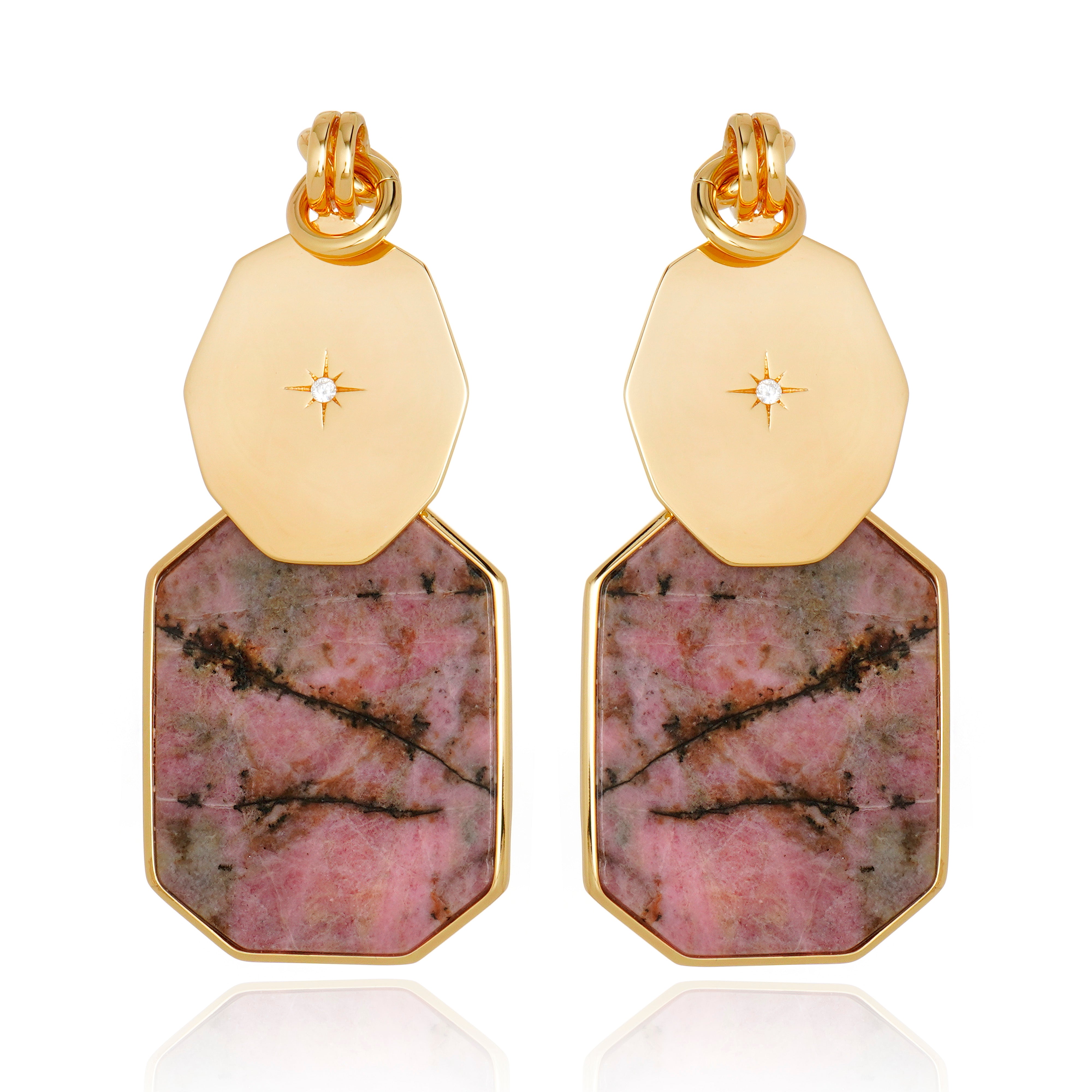 Experience refined elegance with the Icon Lux Double Stack Earring. This design features a layered aesthetic with a polished gold-plated top adorned with a delicate starburst detail and a vibrant rhodonite drop. The rich, rosy hues of rhodonite add warmth and sophistication, while the contrasting textures and shapes create a captivating and bold statement.
