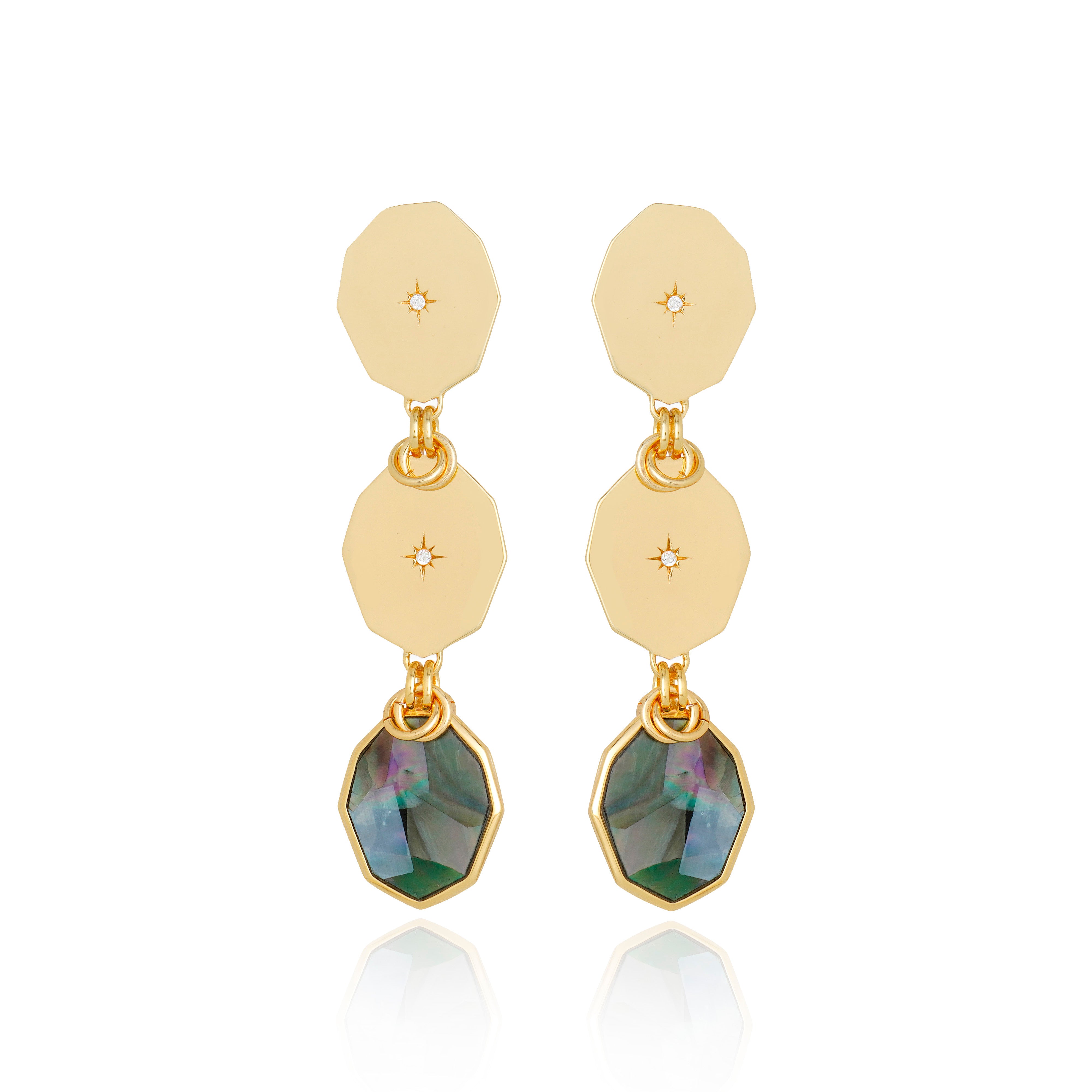 Make a bold statement with the Icon Triple Stack Earring, a masterpiece of modern elegance and intricate craftsmanship. This striking design features three linked geometric shapes, two adorned with a delicate starburst engraving accented with a sparkling detail, and a final segment showcasing the mystical iridescence of black mother-of-pearl.