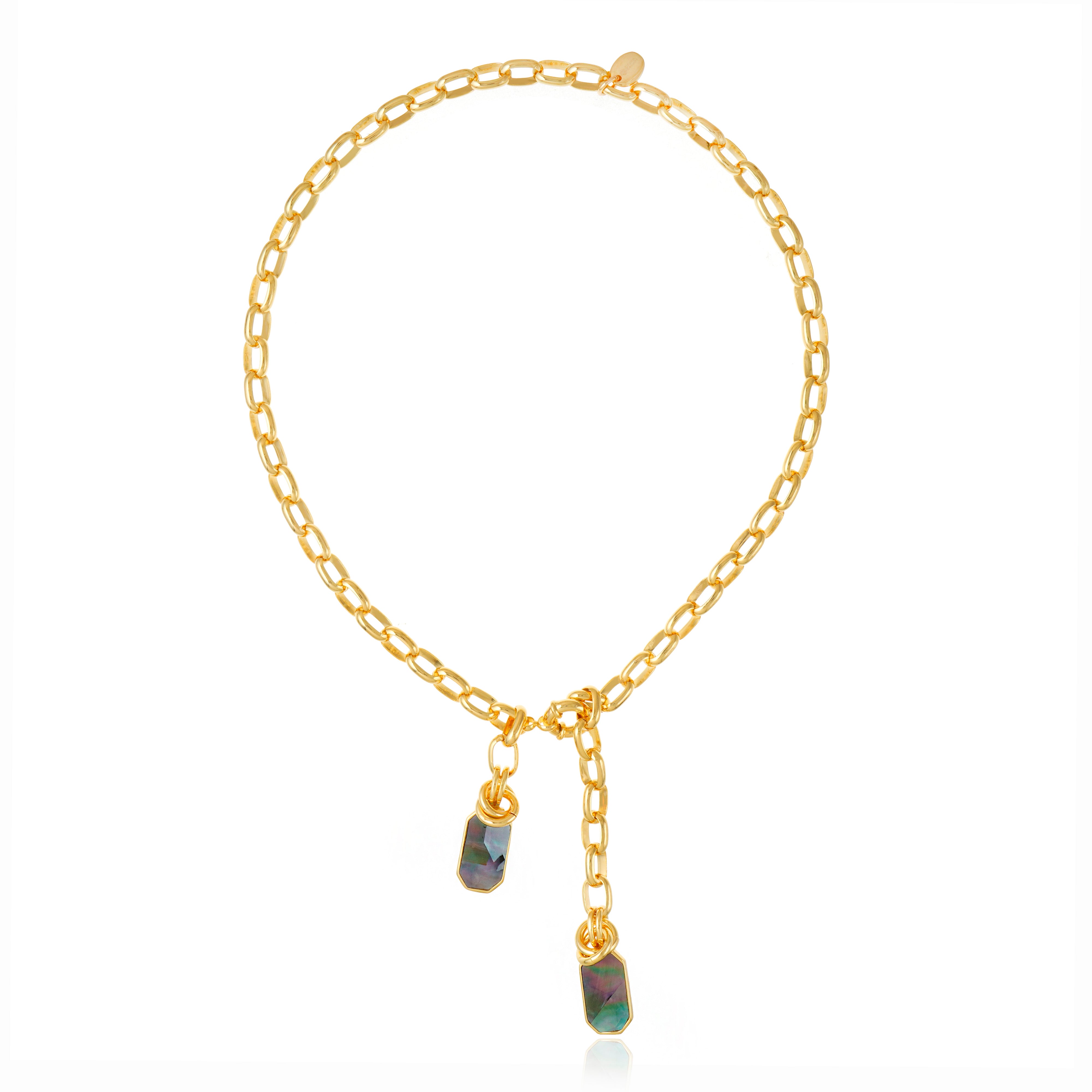 The Icon Pendant Necklace is a timeless piece that blends classic elegance with modern sophistication. Featuring a delicate chain link design, this necklace is adorned with a black mother-of-pearl pendant, exuding an iridescent glow and refined allure. The natural depth of the black mother-of-pearl makes this a versatile piece, perfect for both day and evening wear.