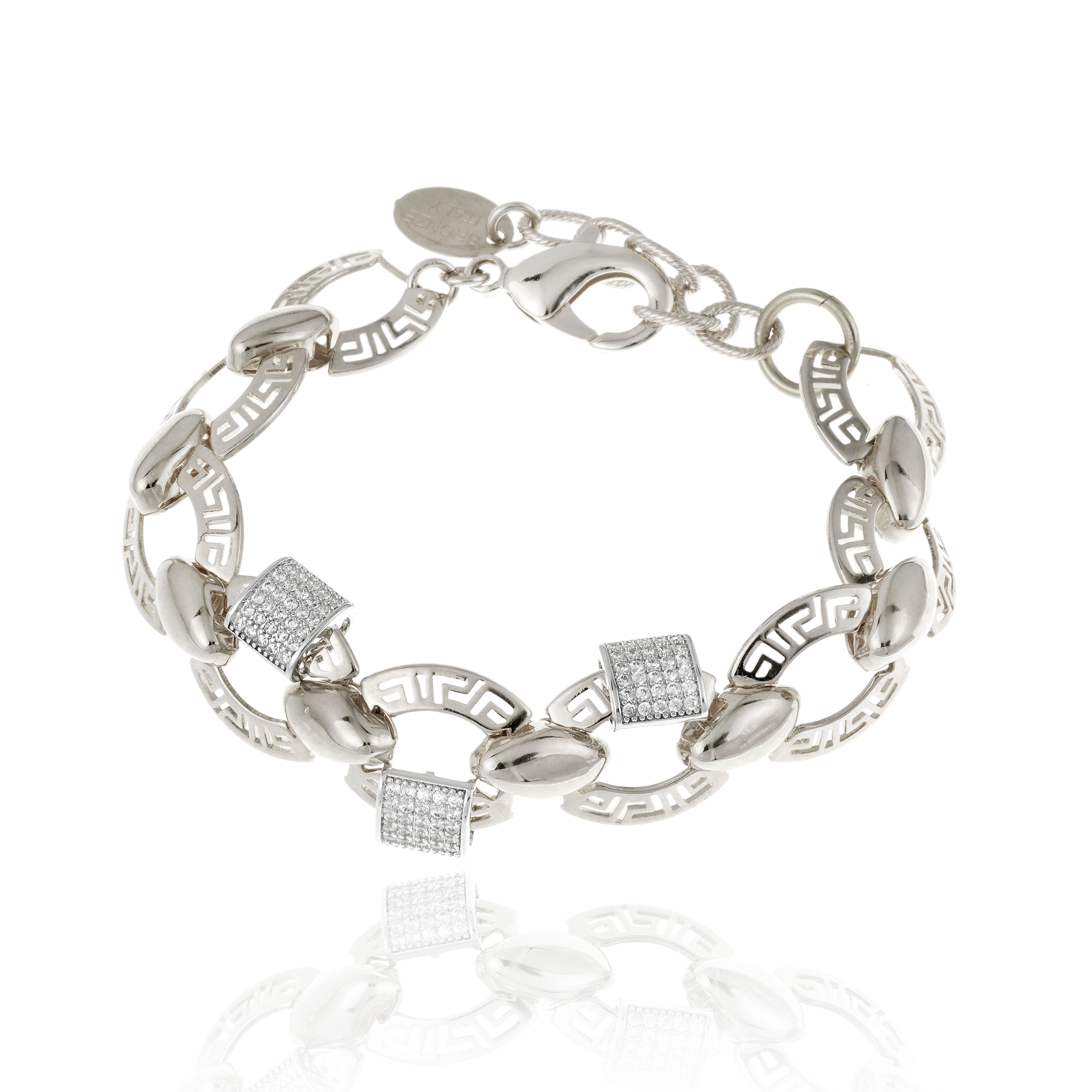The Arona Bracelet showcases a refined interpretation of contemporary Italian chain design. Crafted in rhodium-plated bronze, its sculptural links feature engraved details inspired by classical motifs, elevated with pavé-set cubic zirconia accents that add subtle brilliance and texture.