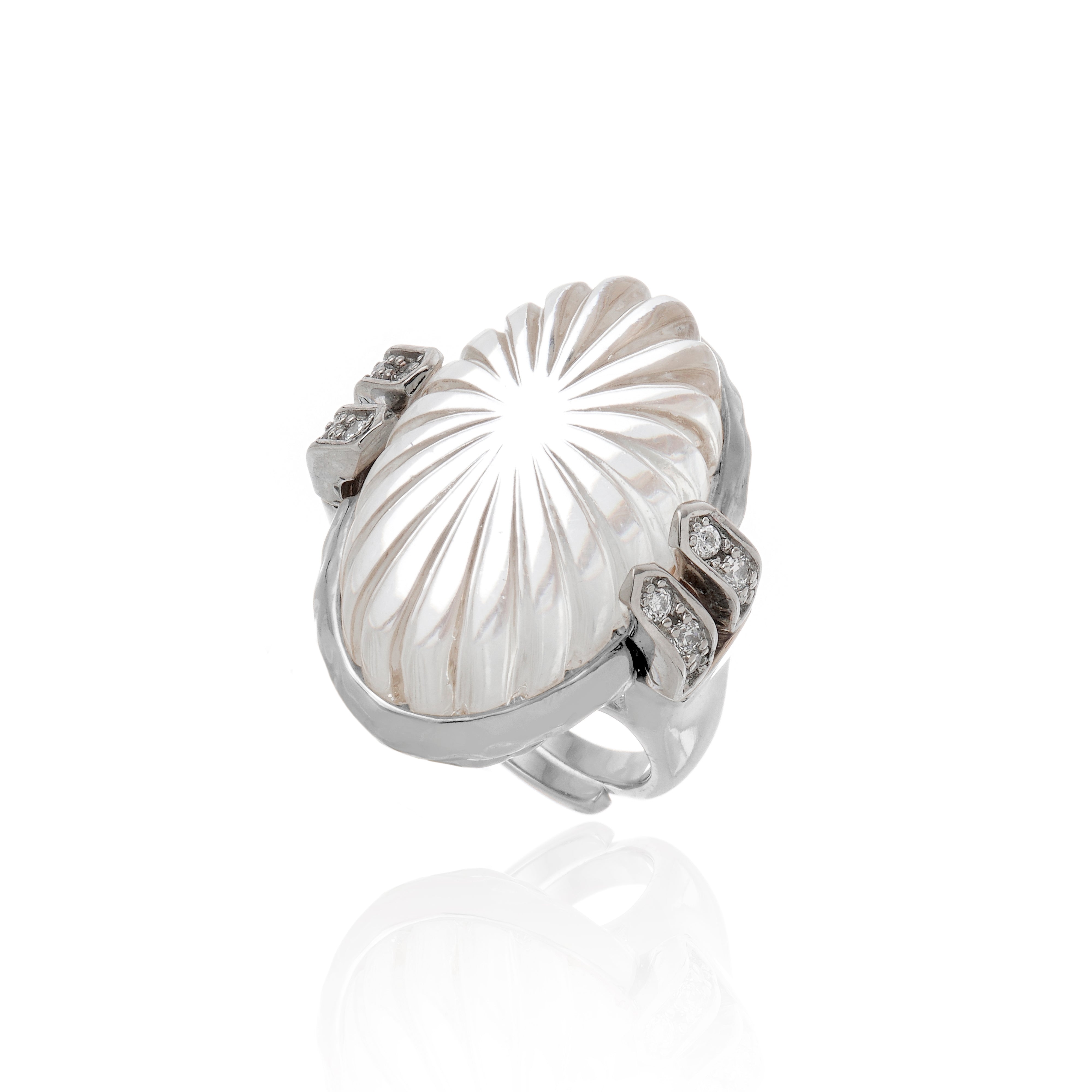 Ethereal and luminous, the Aura Ring captures the lightness of a celestial glow in jewelry form. Crafted in Italy, it features a carved clear resin centerpiece with a radiant shell-like design, embraced by rhodium-plated curves and pavé-set zirconia accents. A piece that speaks of elegance with a modern, airy twist.