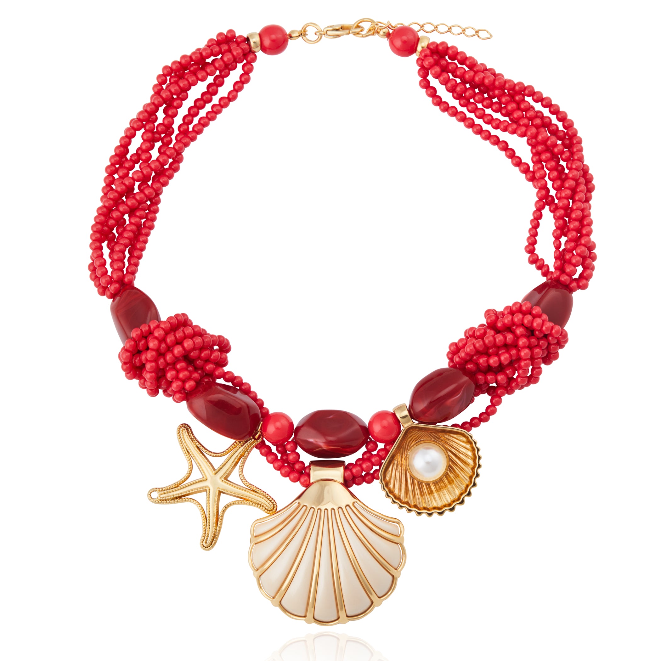 Inspired by the serene beauty of the ocean, the Concept Shell Necklace - Red blends elegant coastal elements with intricate craftsmanship. This statement piece features a gold-plated shell pendant, delicate pearl accents, and handwoven beads in vibrant red tones. Faceted stones and textured starfish details enhance the necklace’s maritime charm, making it a standout accessory for any occasion.