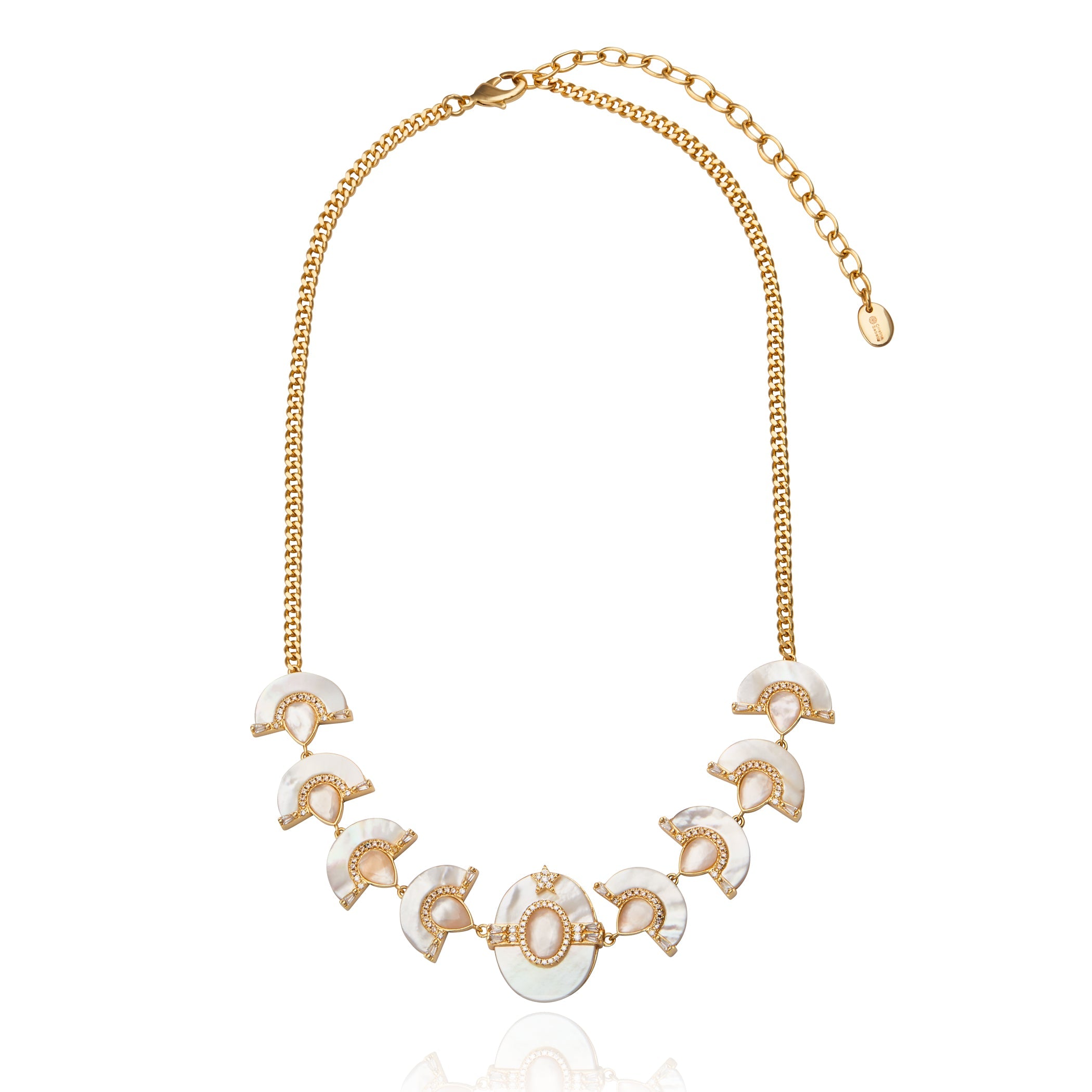 The Elara Necklace - White Mother of Pearl is a stunning blend of celestial elegance and modern design. Crafted with crescent-shaped white mother of pearl segments, adorned with delicate pavé-set cubic zirconia accents, this piece embodies sophistication and grace. The oval centerpiece adds a refined touch, making it the perfect statement necklace for both daytime and evening wear.