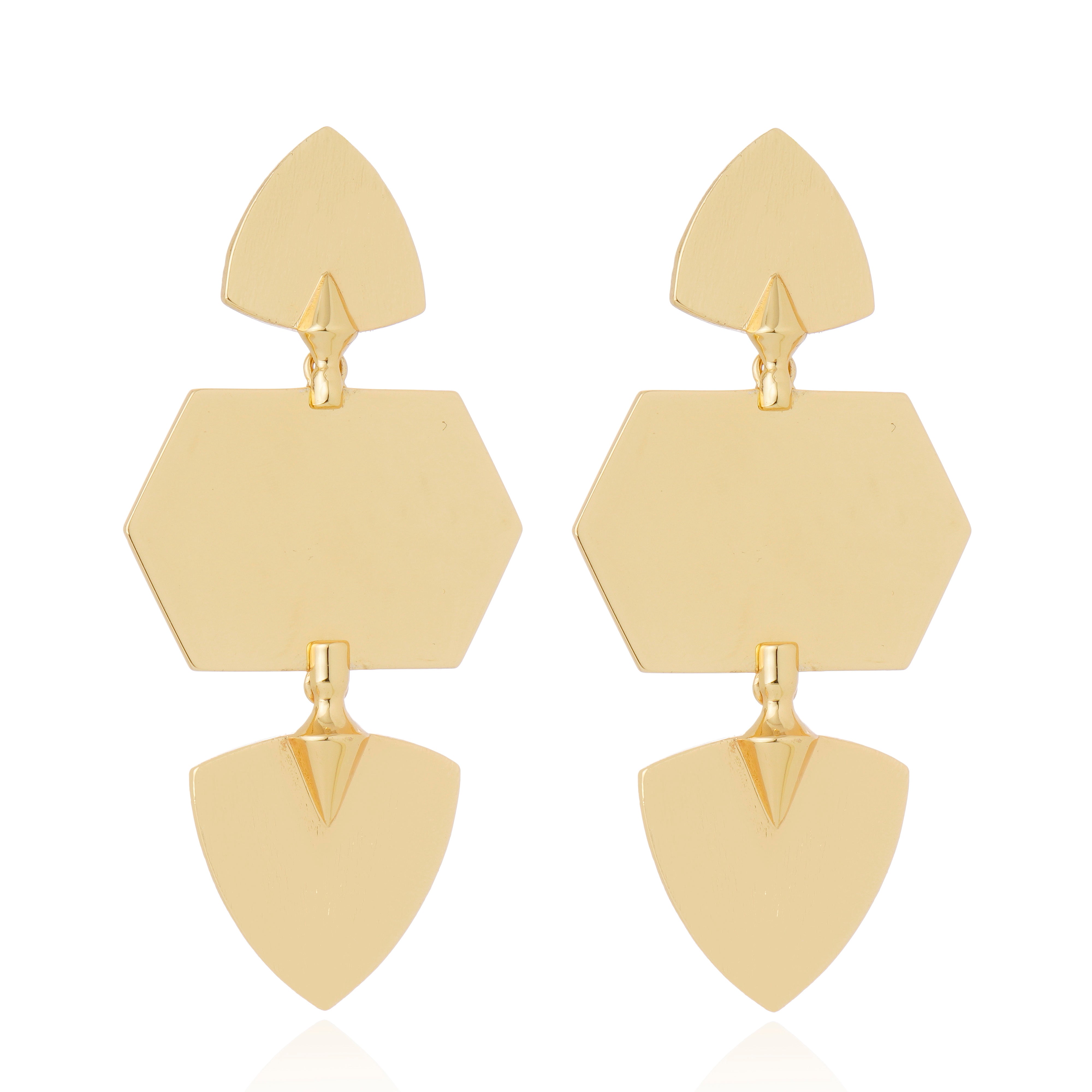 The Selene Earrings embody contemporary elegance through a bold, geometric composition. Crafted in polished gold-plated bronze, the design features layered shield-shaped elements connected by subtle sculptural details, creating movement and visual balance. With a strong yet refined silhouette, these earrings elevate both minimal and statement looks with effortless sophistication.