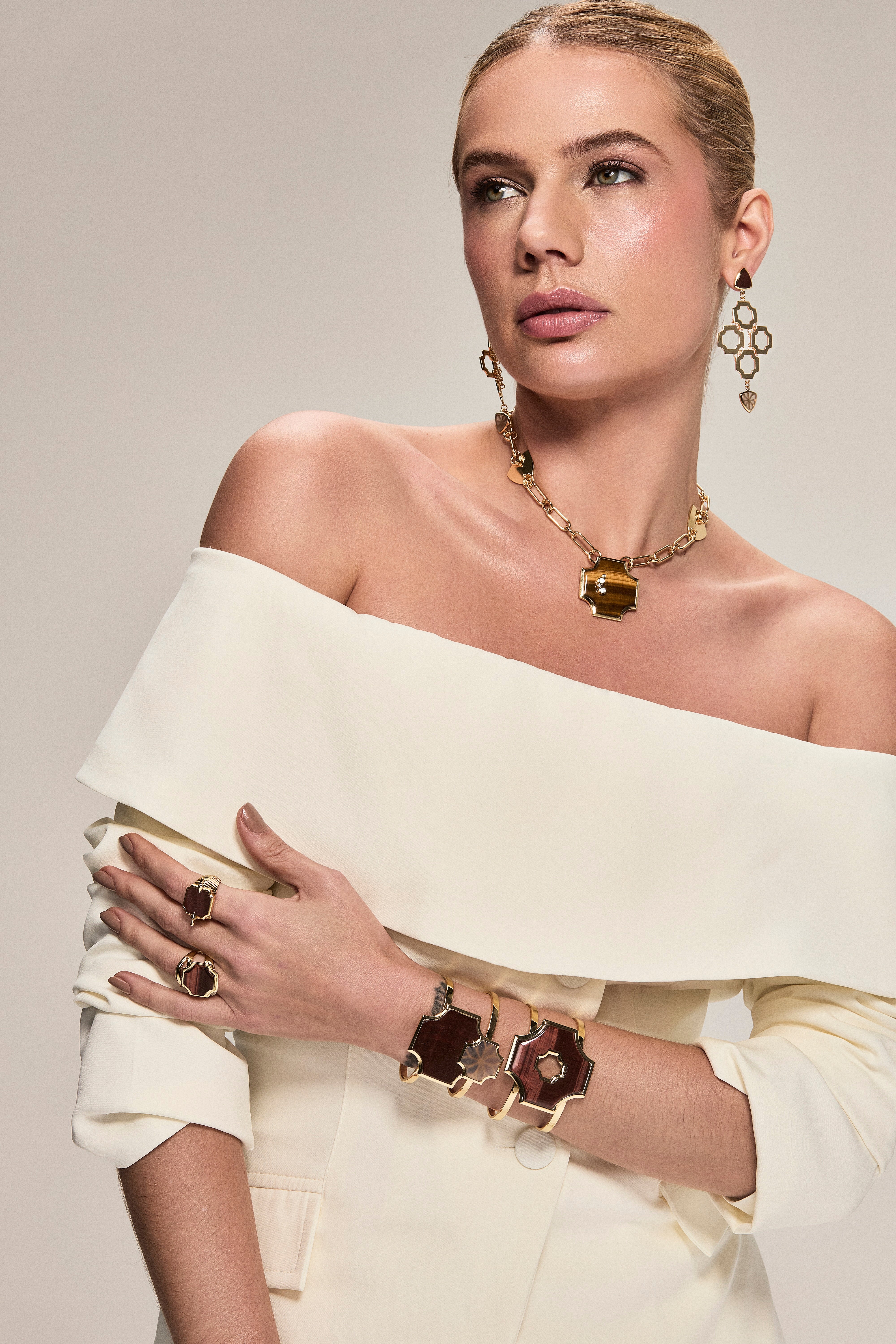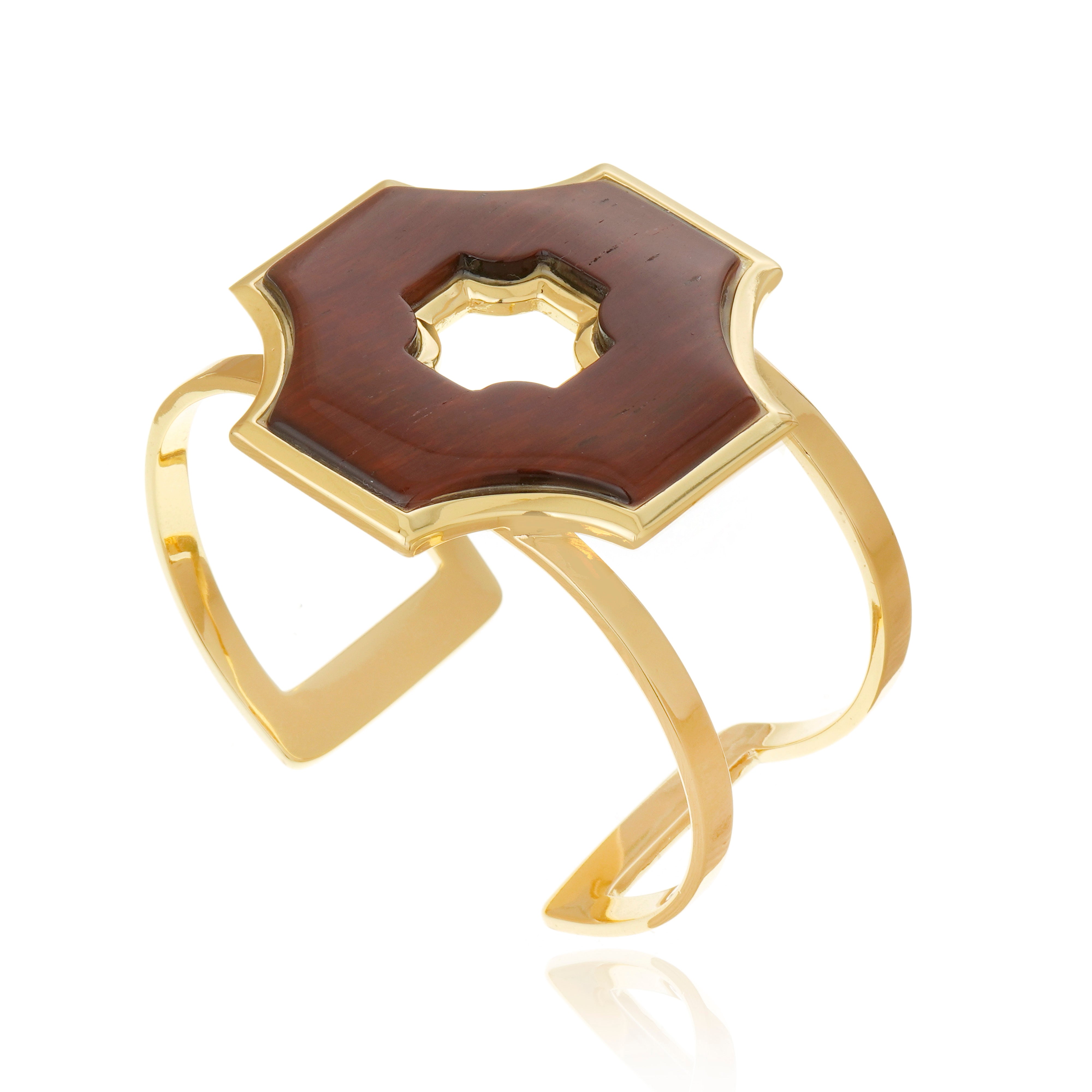 The Ágape Bracelet showcases sculptural elegance with a bold, architectural silhouette enhanced by the natural richness of Tiger’s Eye. Featuring a striking geometric centerpiece framed in polished gold-plated bronze, this open-cuff design highlights the stone’s warm brown tones and organic veining. Refined yet powerful, it is a statement piece that brings depth, strength, and modern sophistication to any look.