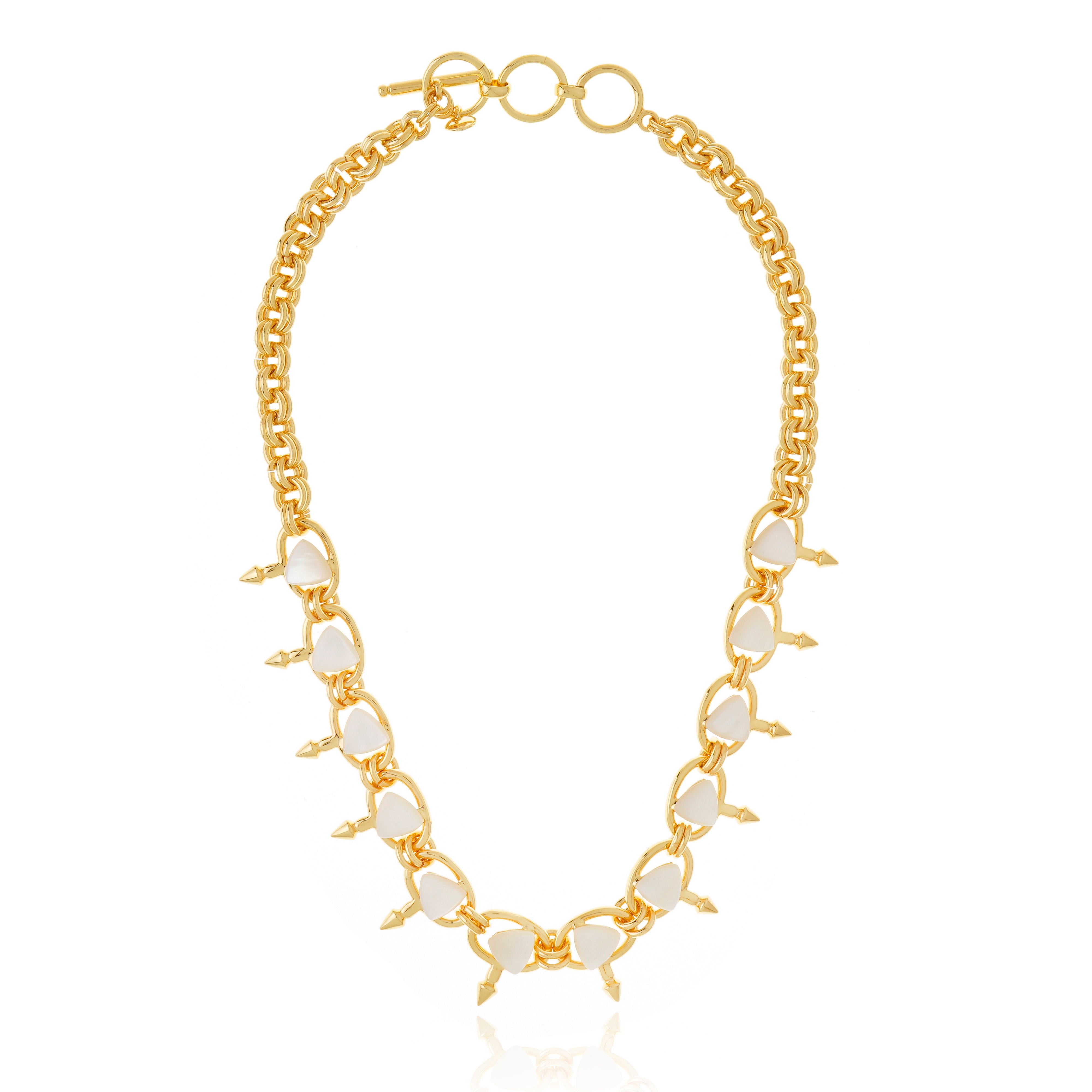 The Aurora Necklace radiates timeless elegance through its bold chain design accented with luminous White Mother of Pearl details. Crafted in gold-plated bronze, this statement piece features a structured silhouette where polished links are punctuated by mother-of-pearl elements, creating a refined contrast between strength and softness. Designed to stand out while remaining effortlessly versatile, it is an elevated choice for both day and evening styling.