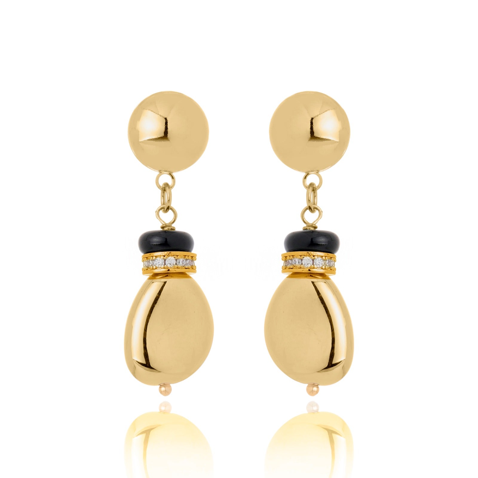 Sculptural and luminous, the Volutta Earrings in black stone exude richness and movement. With polished gold-plated teardrops topped by deep black cabochons and pavé-set zirconia bands, this bold design offers a luxurious balance of texture, shape, and dramatic contrast.
